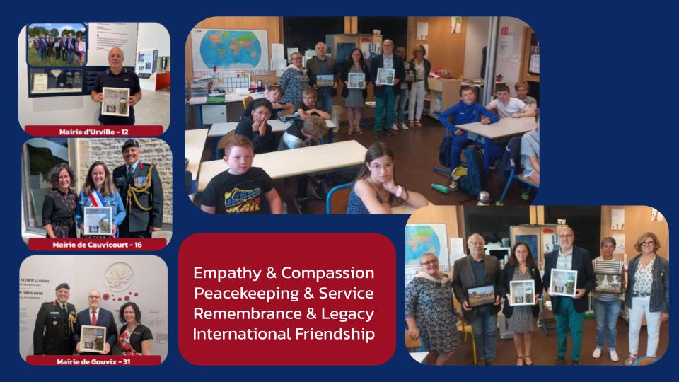 In a powerful display of the project’s educational purpose, mayors from Urville, Cauvicourt, and Gouvix brought their shadow boxes into local classrooms. There, they used the dolls to teach students about empathy, the role of peacekeepers, and how small gestures can create a big impact.